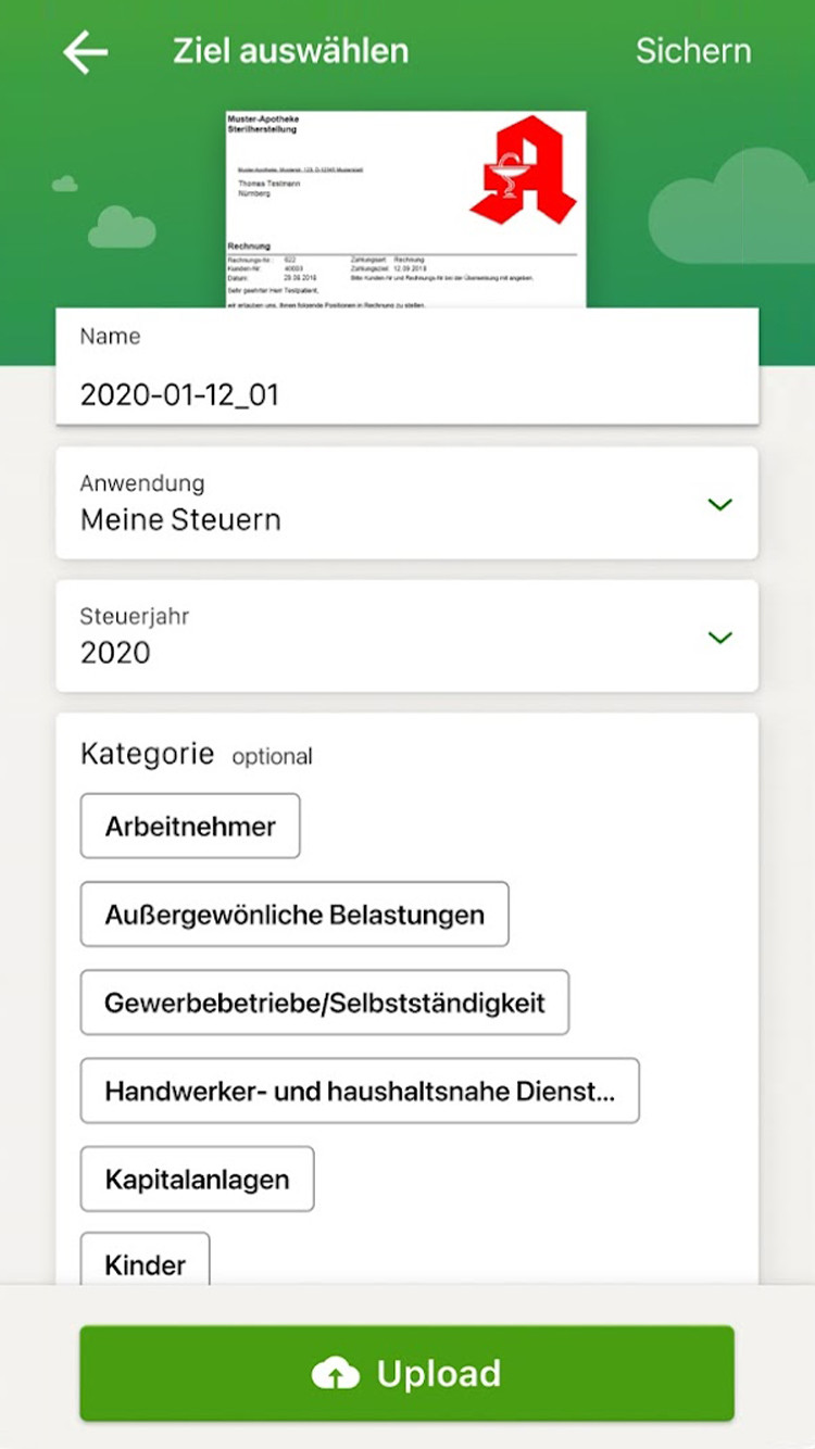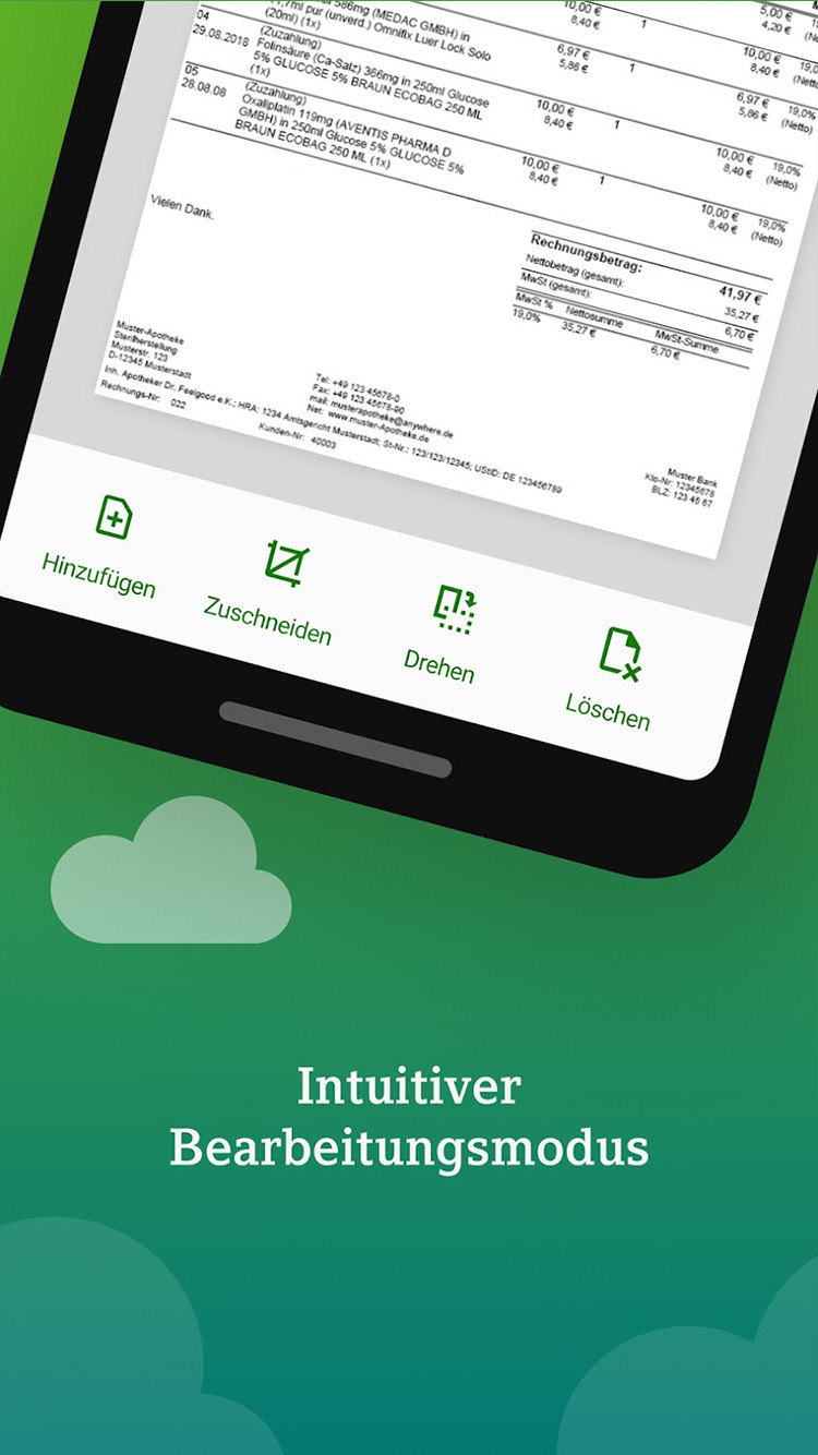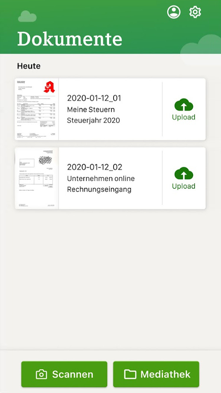 Machen Sie Ihr mobiles Endgerät zum Scanner und digitalisieren Sie schnell und einfach Ihre Belege und Dokumente. Übertragen Sie diese im Anschluss nach DATEV Unternehmen online (Belege online) oder DATEV Meine Steuern jederzeit und von jedem Ort aus. Damit bieten wir einen alternativen Weg für die Belegeinreichung mit hohem Anwenderkomfort.